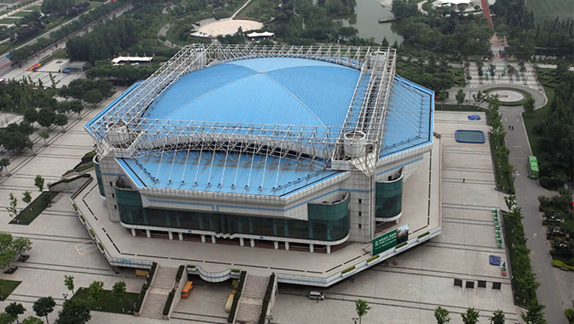 西安市體育館于1997年開始建設,1999年8月竣工。它是西安體育中心的標志性建筑,先后承辦了第四屆城市運動會體操比賽和閉幕式,中國東西部經濟合作與貿易洽談會開幕式等活動。采用寶鋼海藍聚酯彩涂?;鍨?80克/平方米的熱鍍鋅,牌號為TSt01。使用了12年后,涂層顏色依然鮮艷