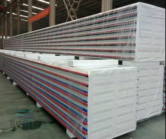 屋面板不應與地面接觸,應用枕木將其墊起,拆開外包裝,檢查每一塊屋面板的幾何尺寸和表面質量,如有缺損及時和和相關部門溝通。