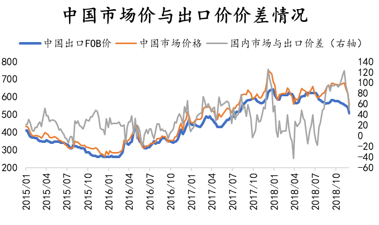 首先在11月下旬中國FOB價格出現(xiàn)大幅的下跌,鋼廠接受海外訂單量增加,并且11月中旬重點鋼企粗鋼日均產(chǎn)量195.15萬噸。11月中旬重點鋼企粗鋼日均產(chǎn)量195.15萬噸,旬環(huán)比增加3.51萬噸,增長1.83%。截至11月中旬末,重點鋼鐵企業(yè)鋼材庫存量為1327.11萬噸,旬環(huán)比增加104.23萬噸,上升8.52%。從鋼企日均產(chǎn)量可以看出,目前鋼材產(chǎn)量還是在不斷上升中,決定目前鋼市價格的還是下游的終端需求,但目前市場供大于求的狀況未有改變,并且國內貿(mào)易商冬儲意向并不明顯,且部分地區(qū)出現(xiàn)停工現(xiàn)象,導致鋼廠出口意愿增加。另外中美貿(mào)易戰(zhàn)進入90天“停火期”,這也利好鋼材的出口增加。綜合來看,12月份出口量或接近600萬噸,同環(huán)比均會有所上漲。